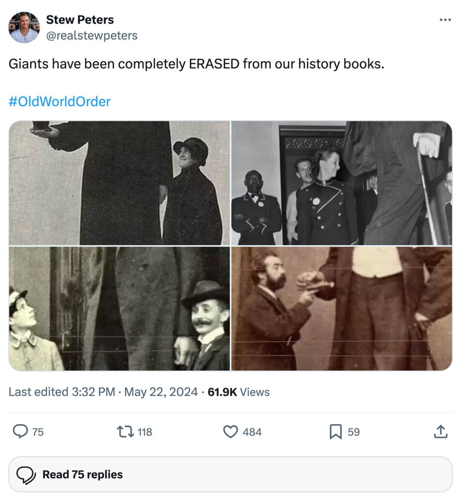 In May of 2024, Stew Peters posted a series of photos supposedly taken in the early twentieth century that featured “normally proportioned” giants beside average people. Peters, who started out as a rapper from Minnesota1, became a popular far-right personality through his podcast, in which he has promoted QAnon talking points, supported Pizzagate and flat-Earth conspiracies, espoused COVID-19 and Holocaust denialism, and engaged in violent rhetoric directed against minoritized groups. The Trump-appointed head of the FBI, Kash Patel, has been on Peters’s podcast more than a handful of times.