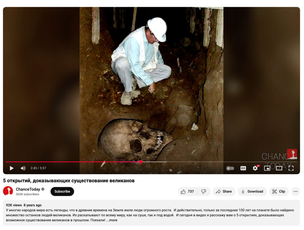 Still of YouTube video, “Five Discovories Proving the Existence of Giants” (“5 открытий, доказывающих существование великанов,” UPLOADED BY USER, ChanceToday, https://www.youtube.com/watch?v=Ww-n2Kn6UfE